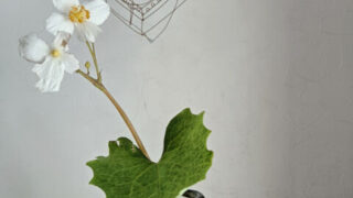 白い花が一輪庭の片隅にひっそり咲いていました。名はイチリンソウ? いつどんな経緯で我が家で花を咲かせたのか 萩ガラスの緑によく似合います。