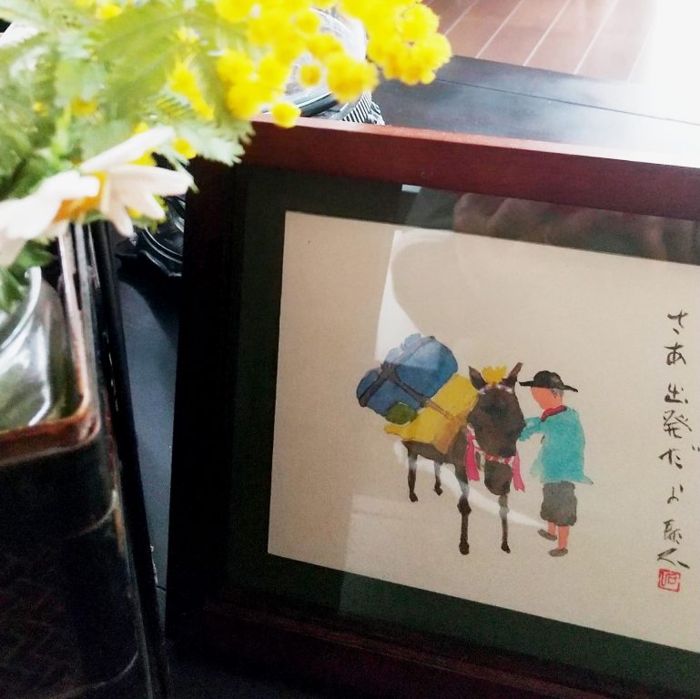 茶館に新しい絵、タイトルは「さあ 出発だよ」。中国宋の時代から雲南省からチベットまで馬でお茶を運ぶ過酷な旅がありました。