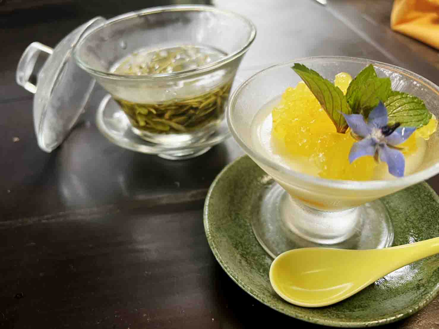 今月のお茶は浙江省の龍井茶。お茶請には甘夏のヨーグルトムース。深緑の中で時を忘れて楽しむお茶の時間は格別です。
