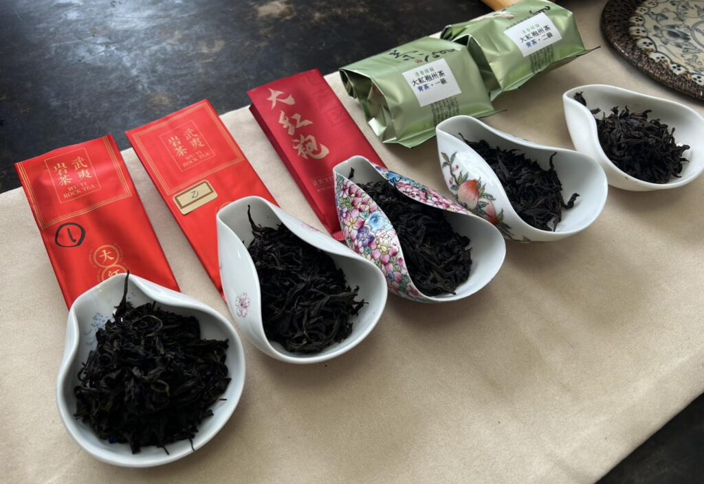 岩茶大紅袍の故郷は中国福建省武夷山。この山は世界遺産でもあり、正山と呼ばれる武夷山中で収穫されるお茶と近郊の畑で収穫される洲茶があります。今月の教室では5種の岩茶をの飲み比べてみました。違った環境で育ったお茶には大きな特徴があります。茶葉の色、形、味、香りを確かめながらじっくりと岩茶を味わう貴重な時間でした。
