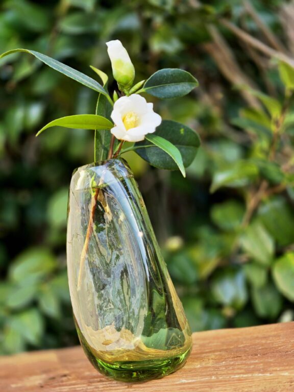 早春の中で お知らせ 2026.02.13 可愛いくて素朴な一輪挿しを見つけました。コロナ禍を機に沢山あった骨董市が激減し、楽しみを奪われていました。偶然立ち寄った近くのお店で見つけた花瓶。凛と咲く侘助を活けてみました。